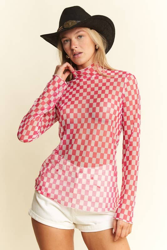 CHECKERBOARD PRINT MESH MOCK NECK TOP