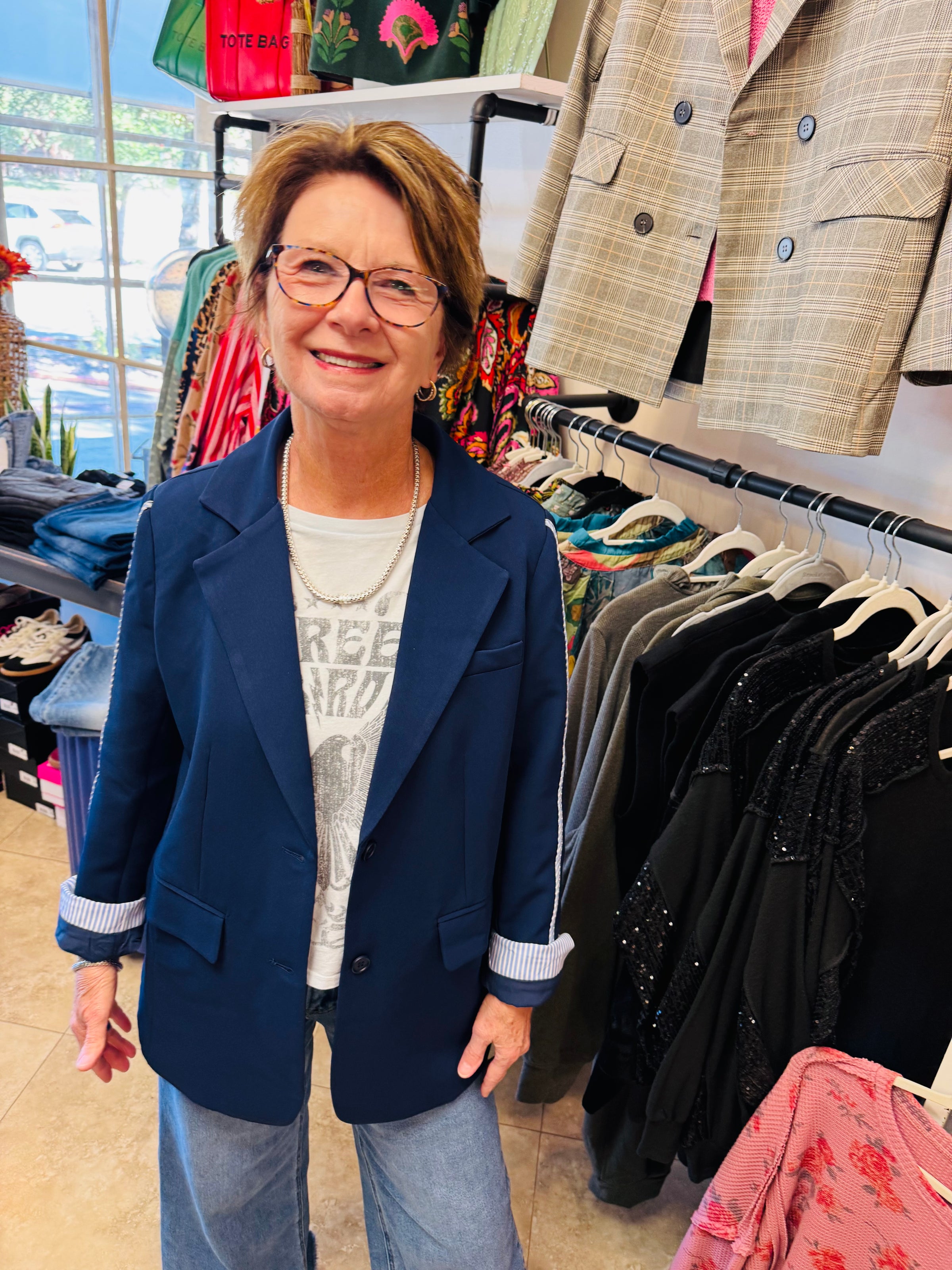 This navy blazer with a touch of seersucker on the sleeves is the perfect addition for work or dinner out with the girls!! Runs true to size.