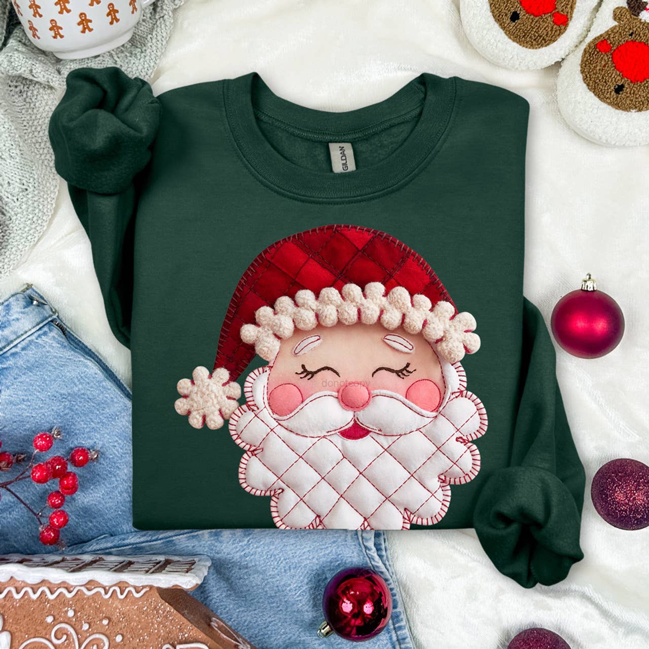 Add a touch of handmade holiday charm with this faux patchwork Santa design. Featuring a quilted-style Santa face with rosy cheeks, a stitched red hat, and cozy white details, it gives that festive, homespun feel — no actual fabric patches, just the look of them. The mix of nostalgic Christmas tones and boutique style makes it perfect for baking days, tree trimming, or sipping cocoa by the fire. A cheerful Santa that brings classic holiday spirit to every cozy moment. G18000 Forest and Light Pink Material: 50/50 cotton/polyester blend. Features: Side-seamed. Unisex sizing. Crew neck. Ribbed cuffs and waistband.