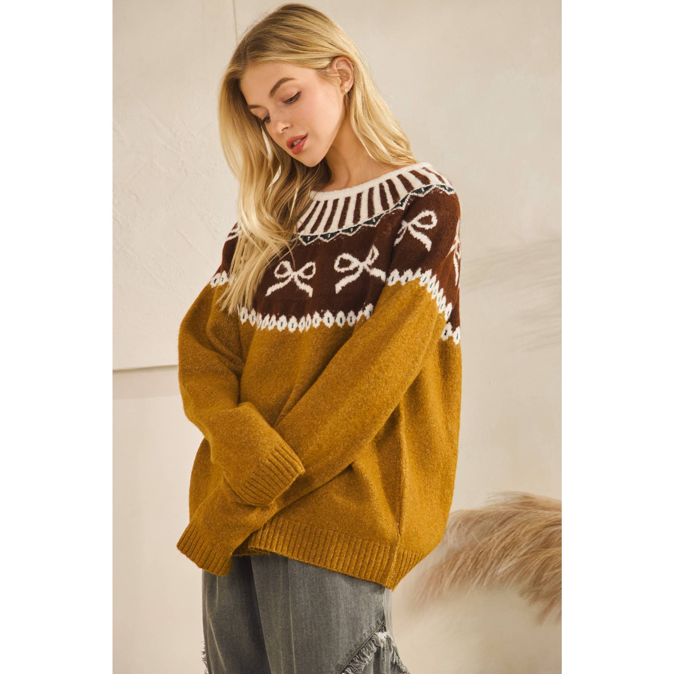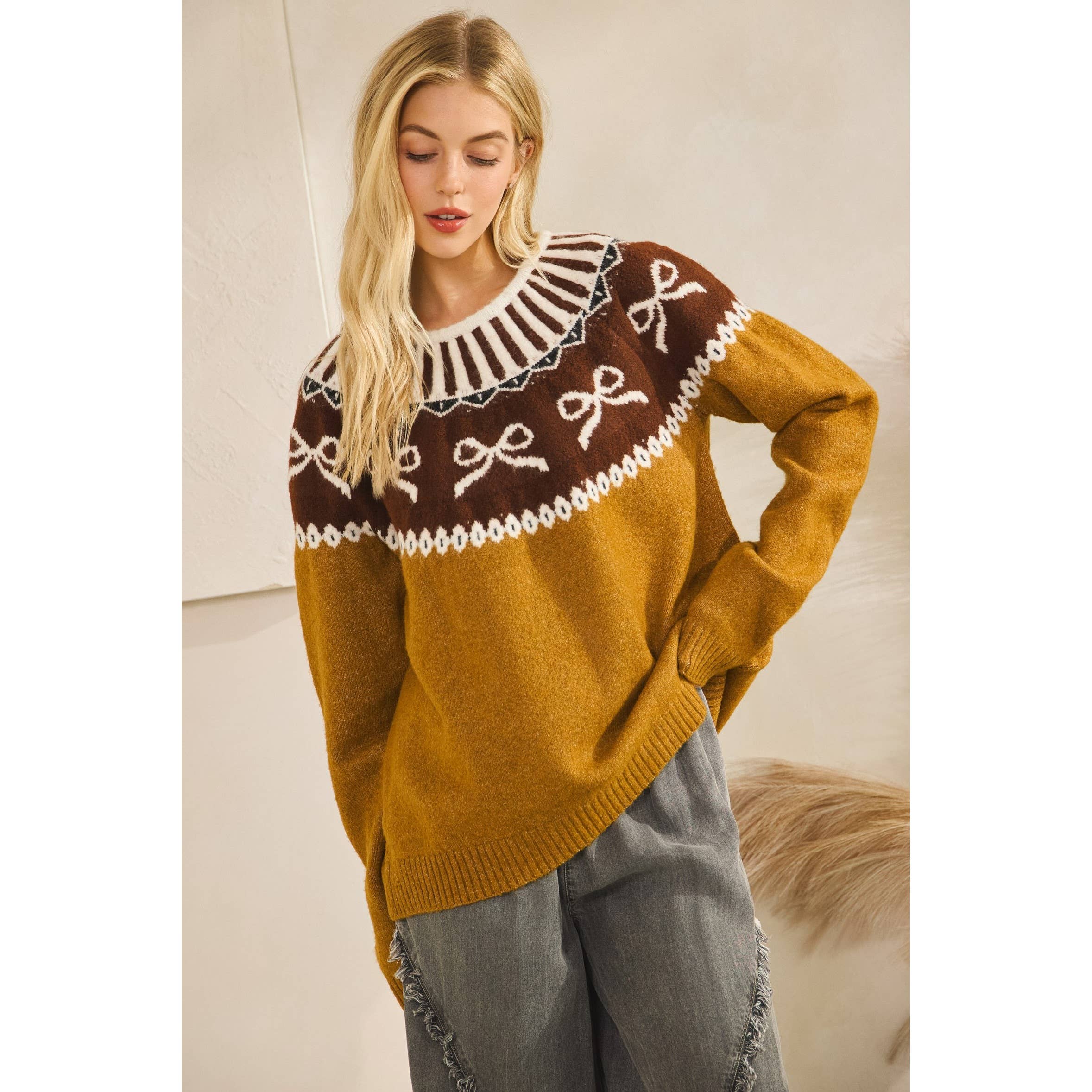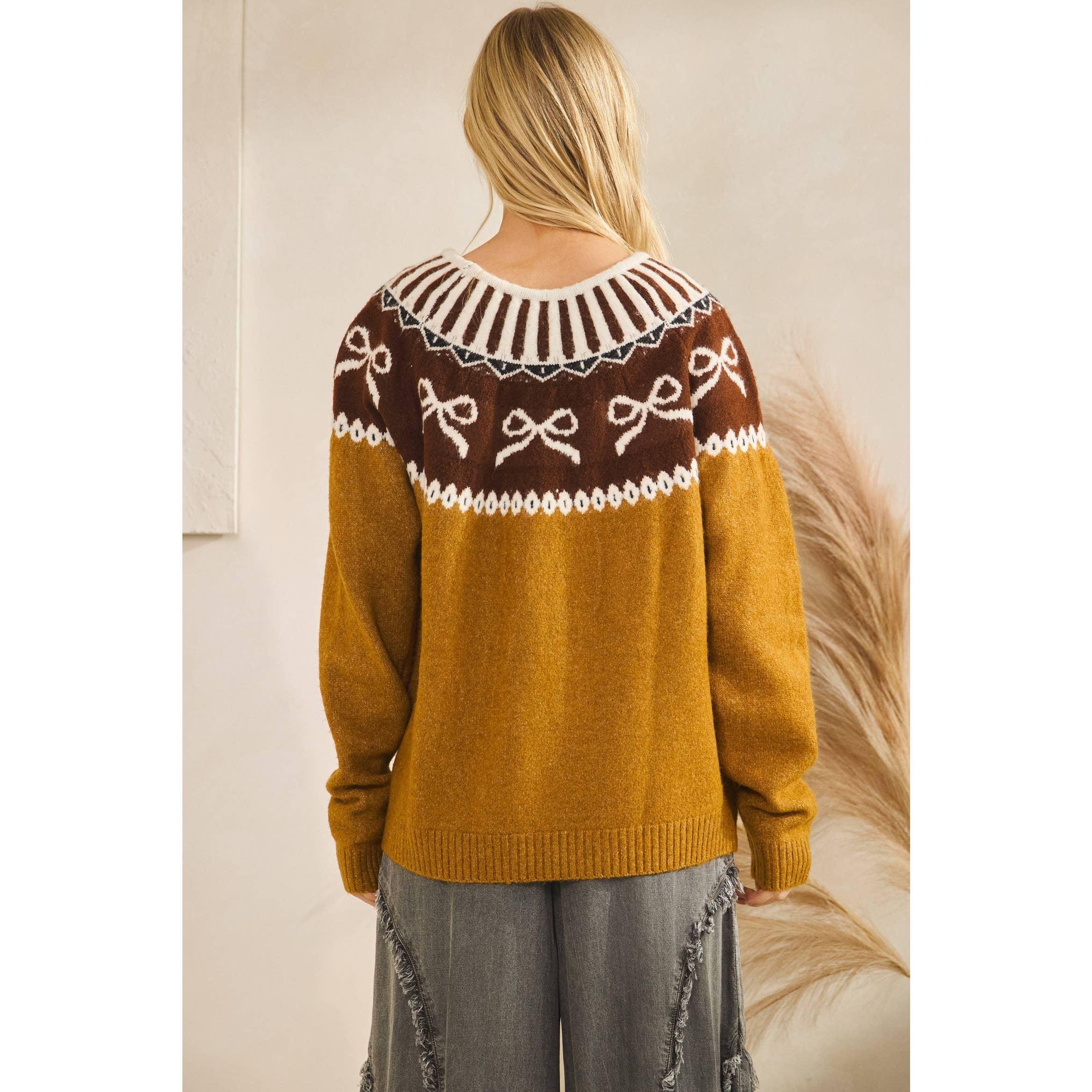 Features a playful bow-knit yoke design in creamy white atop a deep chocolate and mustard base. The fair isle-inspired neckline adds just the right touch of seasonal flair, while the relaxed silhouette makes it an easy throw-on-and-go piece.