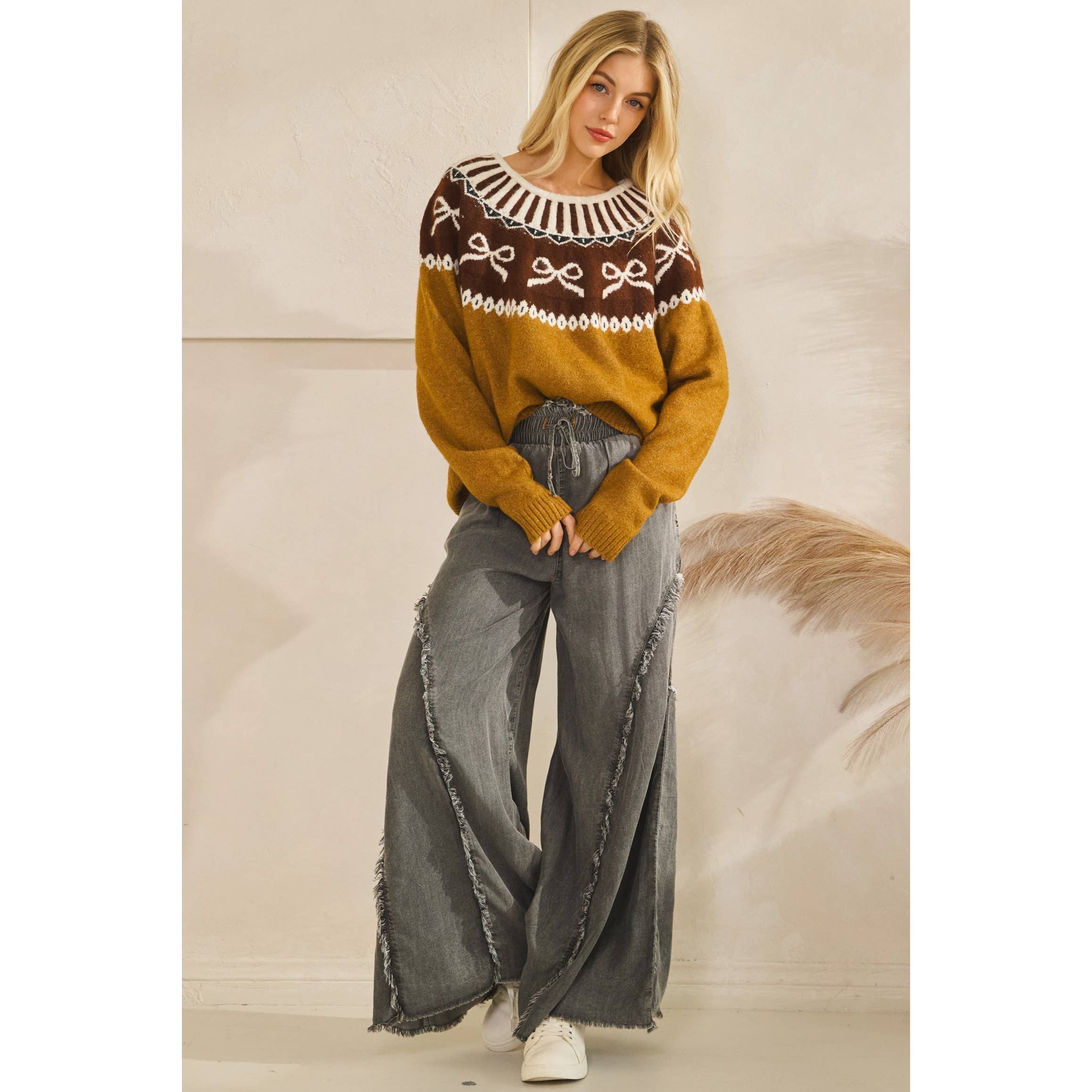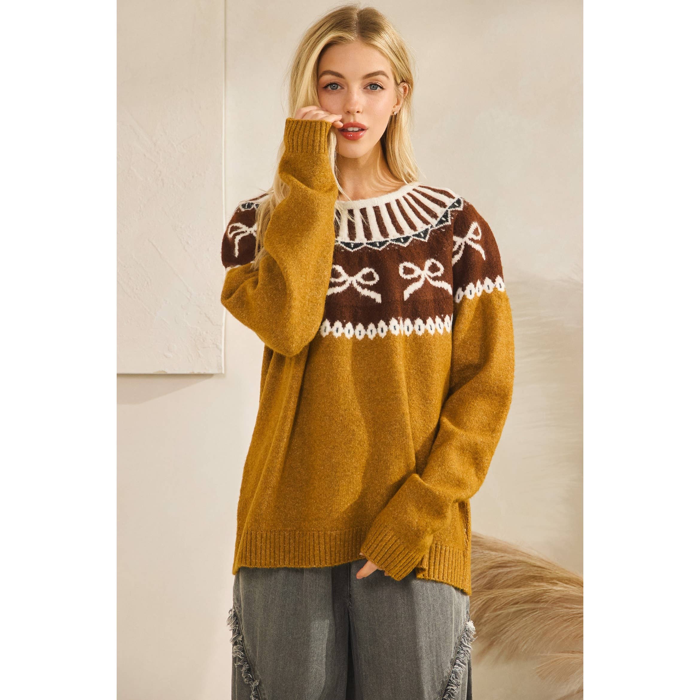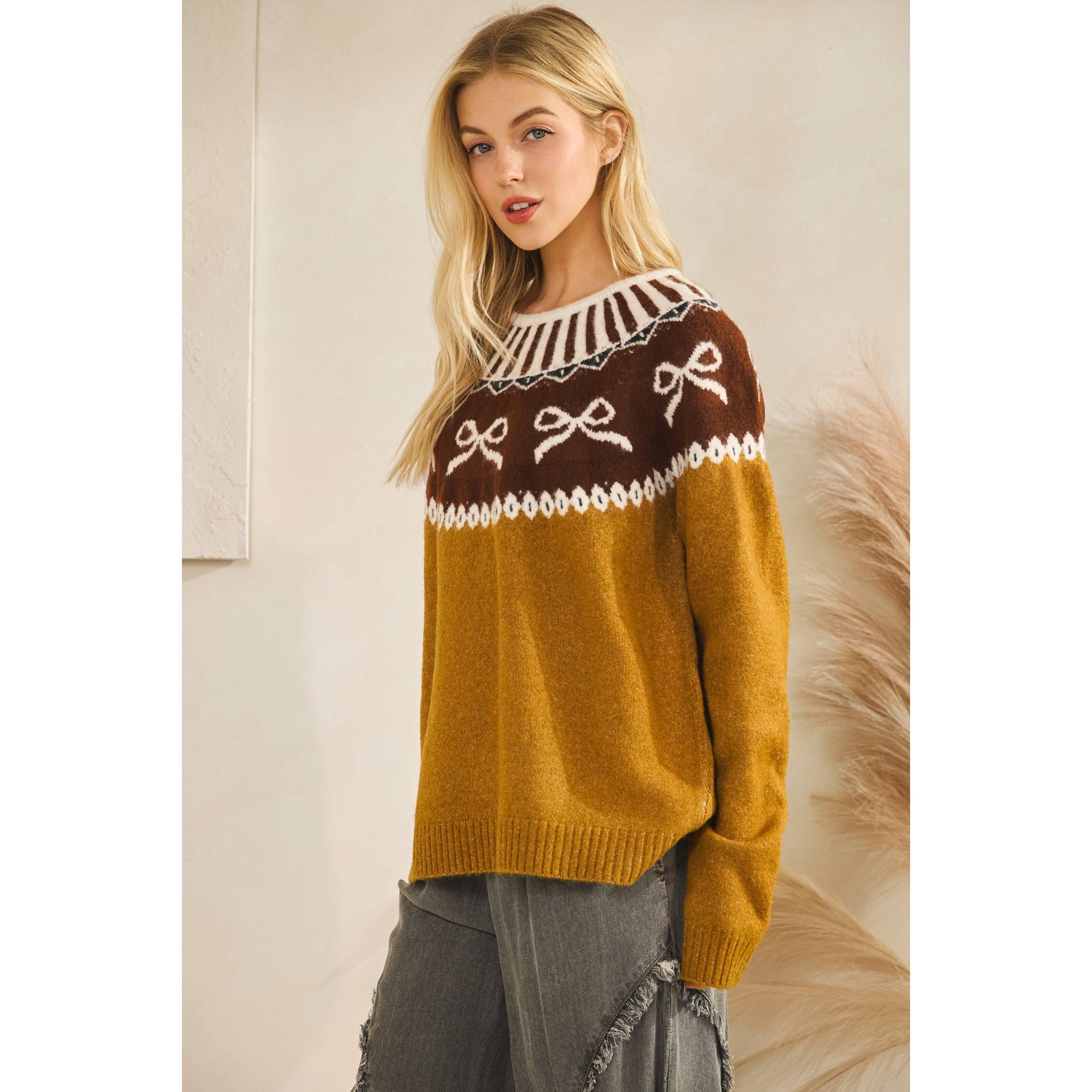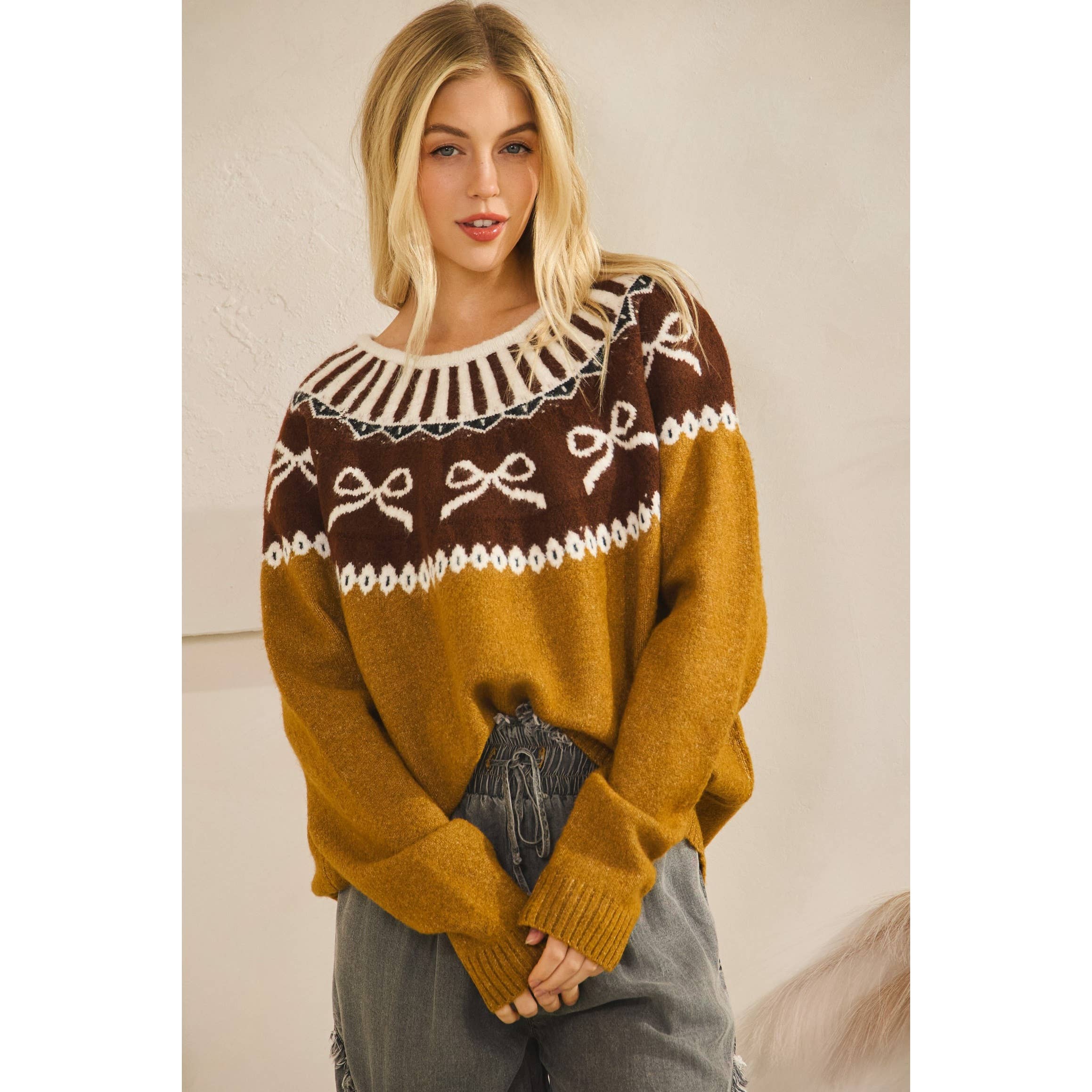 Features a playful bow-knit yoke design in creamy white atop a deep chocolate and mustard base. The fair isle-inspired neckline adds just the right touch of seasonal flair, while the relaxed silhouette makes it an easy throw-on-and-go piece.