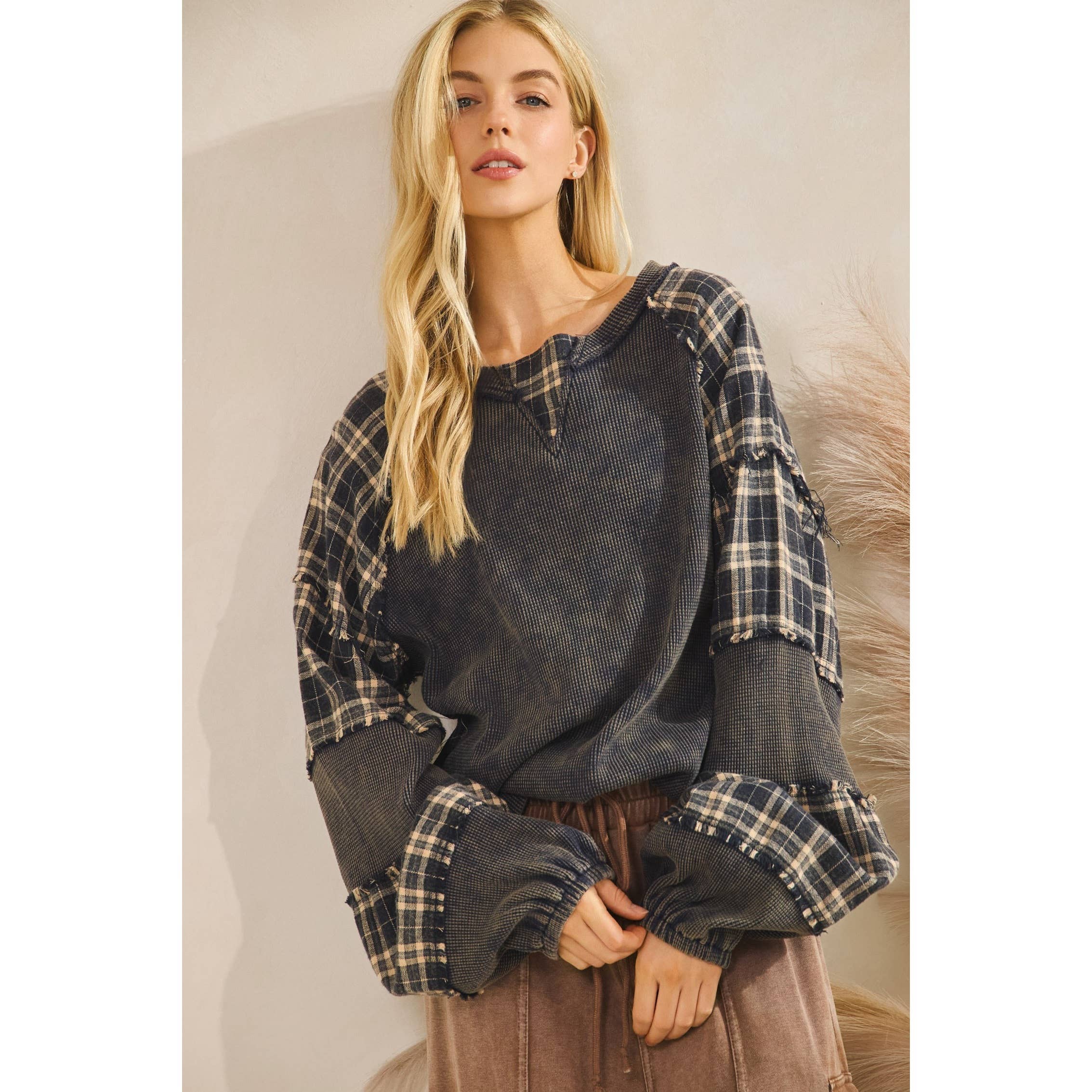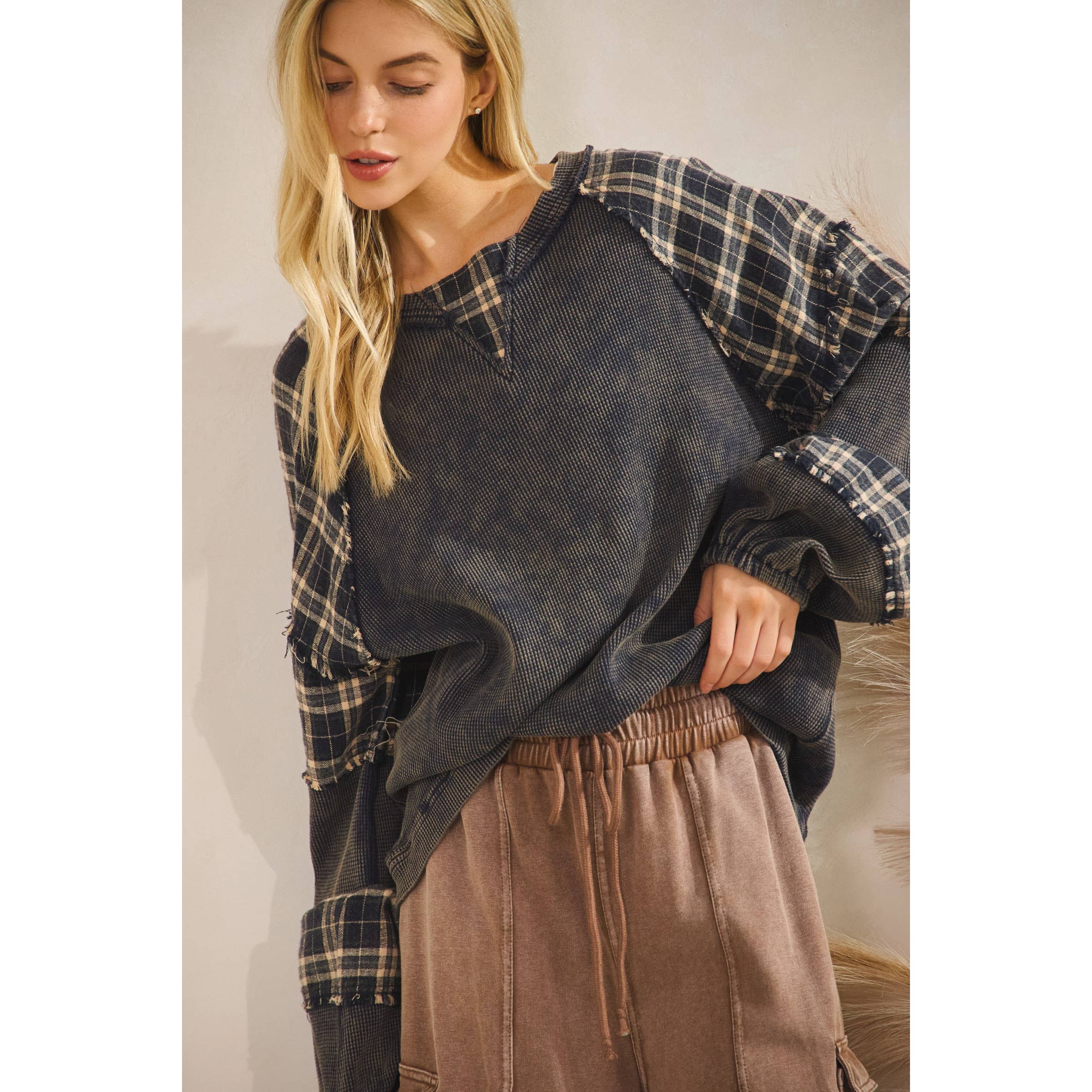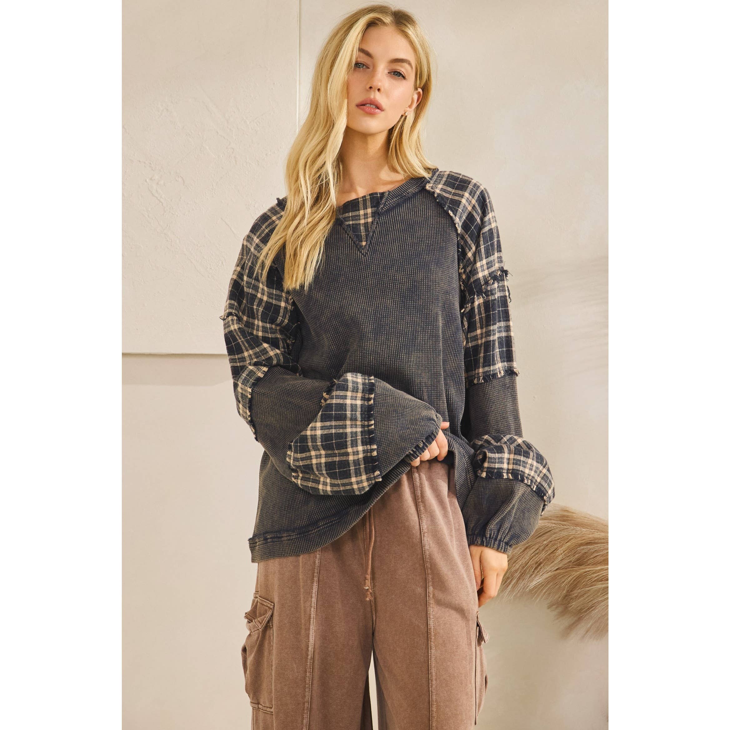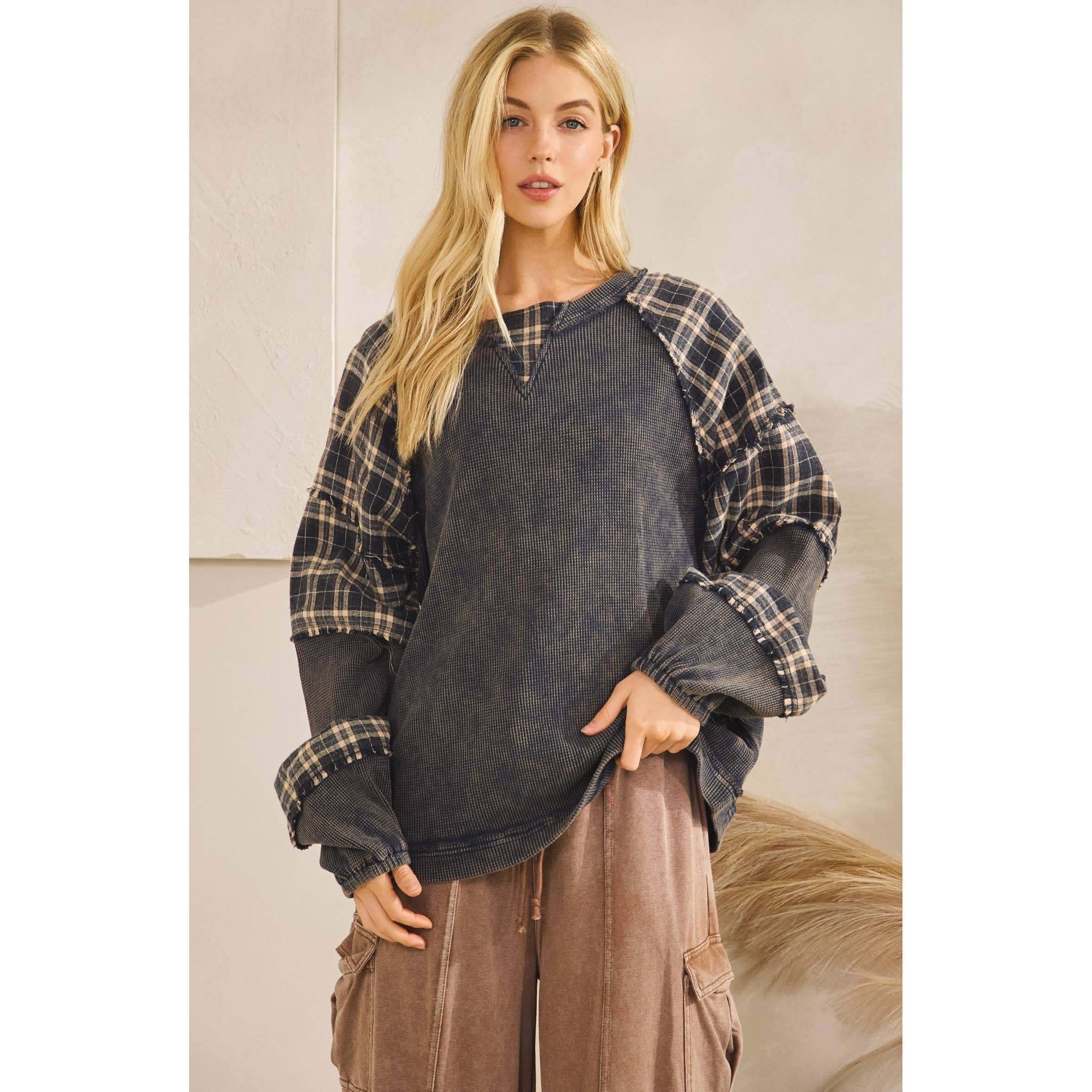 THE PATCHWORK PLAID SLEEVE PULLOVER - WASHED WAFFLE KNIT - CONTRAST PLAID PATCH SLEEVES WITH RAW EDGES - WIDE CREW NECKLINE WITH TONAL TRIANGLE STITCH - EXPOSE SEAMS AND RELAXED BALLOON SLEEVES - SLOUCHY, OVERSIZED SILHOUETTE Features a washed waffle knit body paired with mixed plaid and solid panels on the sleeves for that perfect cozy clash. Frayed edges and exposed seam details add a rugged touch, while the oversized fit keeps it comfy and boutique-ready. 100% COTTON
