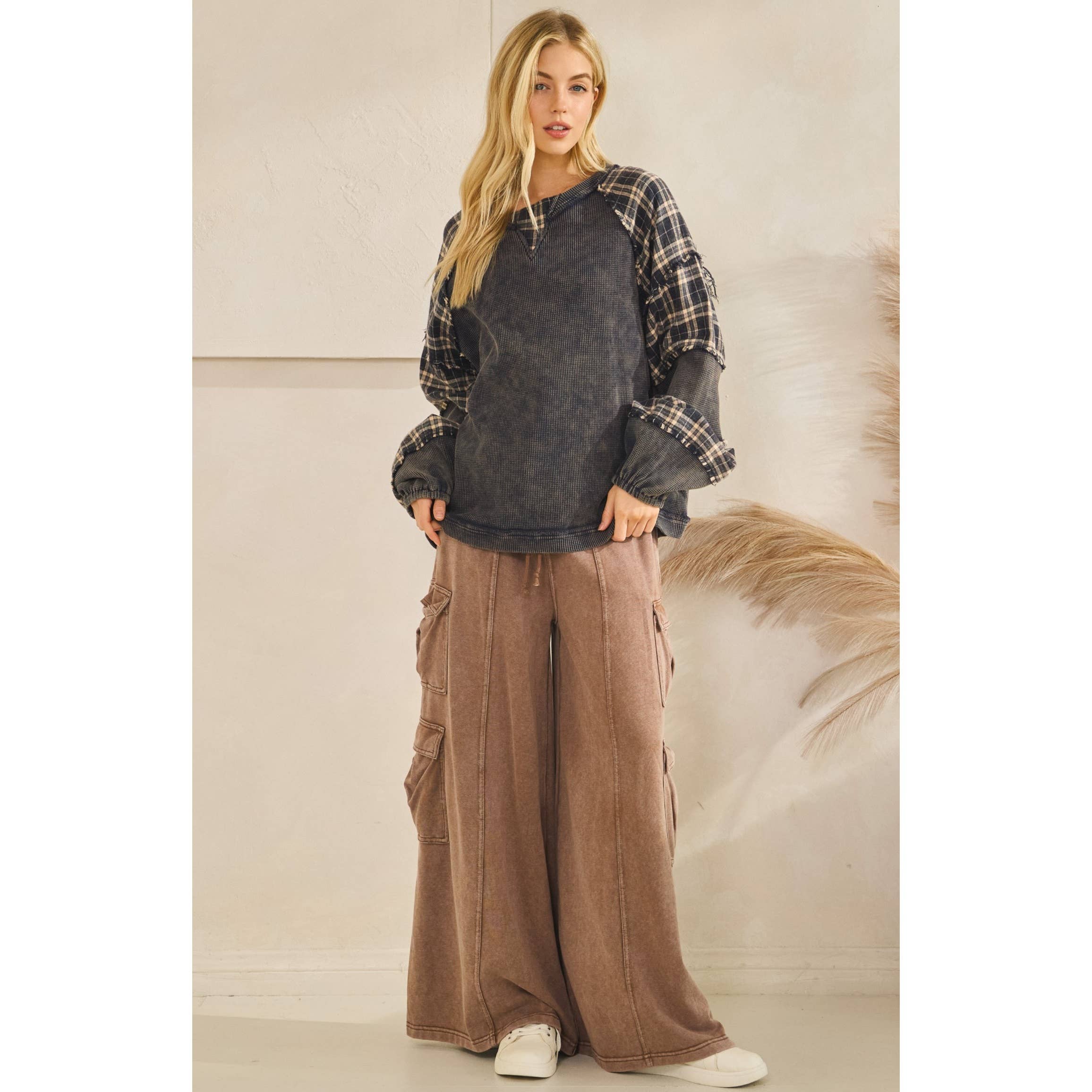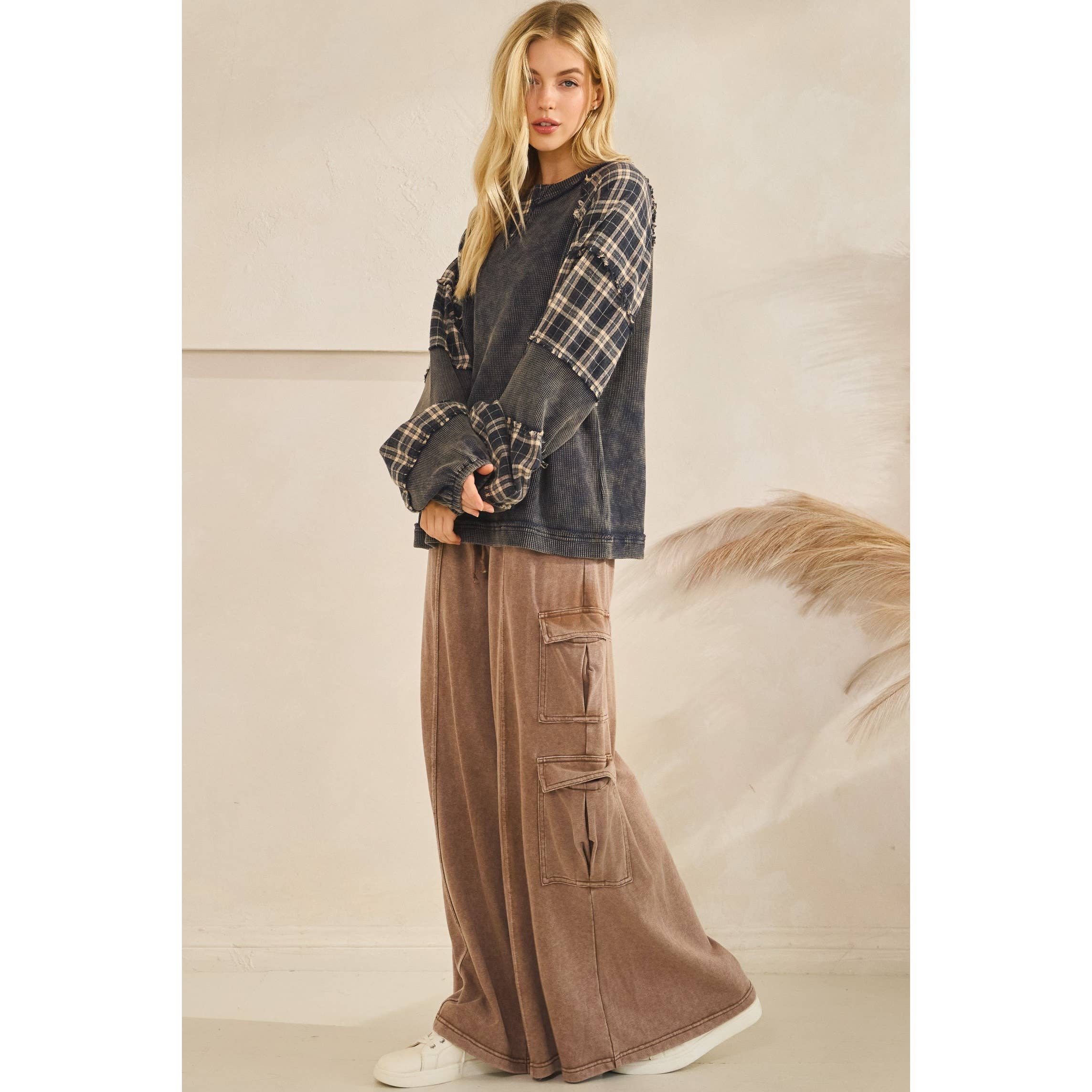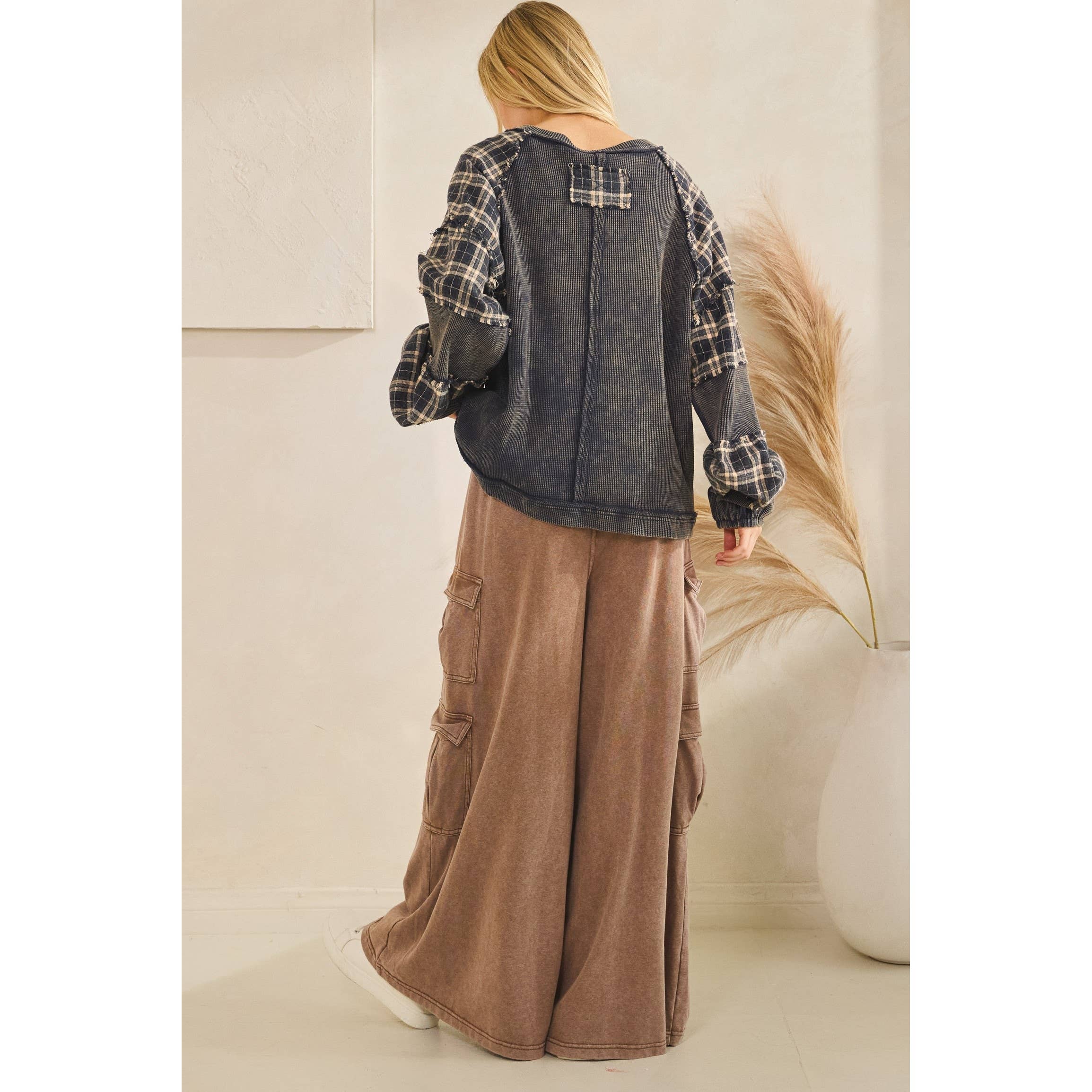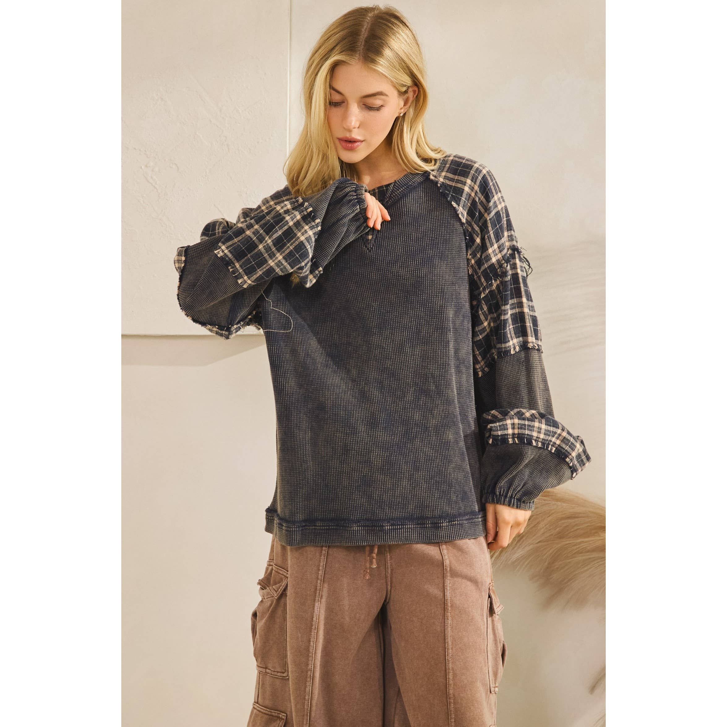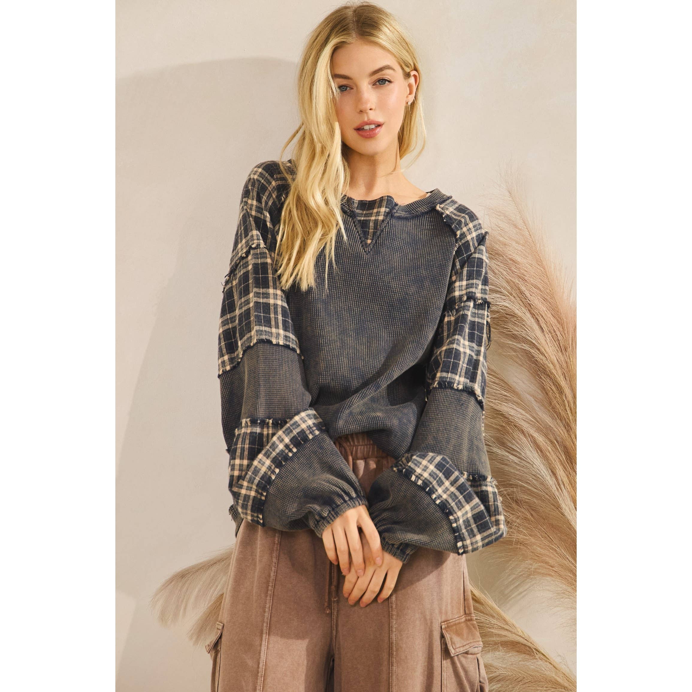 THE PATCHWORK PLAID SLEEVE PULLOVER - WASHED WAFFLE KNIT - CONTRAST PLAID PATCH SLEEVES WITH RAW EDGES - WIDE CREW NECKLINE WITH TONAL TRIANGLE STITCH - EXPOSE SEAMS AND RELAXED BALLOON SLEEVES - SLOUCHY, OVERSIZED SILHOUETTE Features a washed waffle knit body paired with mixed plaid and solid panels on the sleeves for that perfect cozy clash. Frayed edges and exposed seam details add a rugged touch, while the oversized fit keeps it comfy and boutique-ready. 100% COTTON