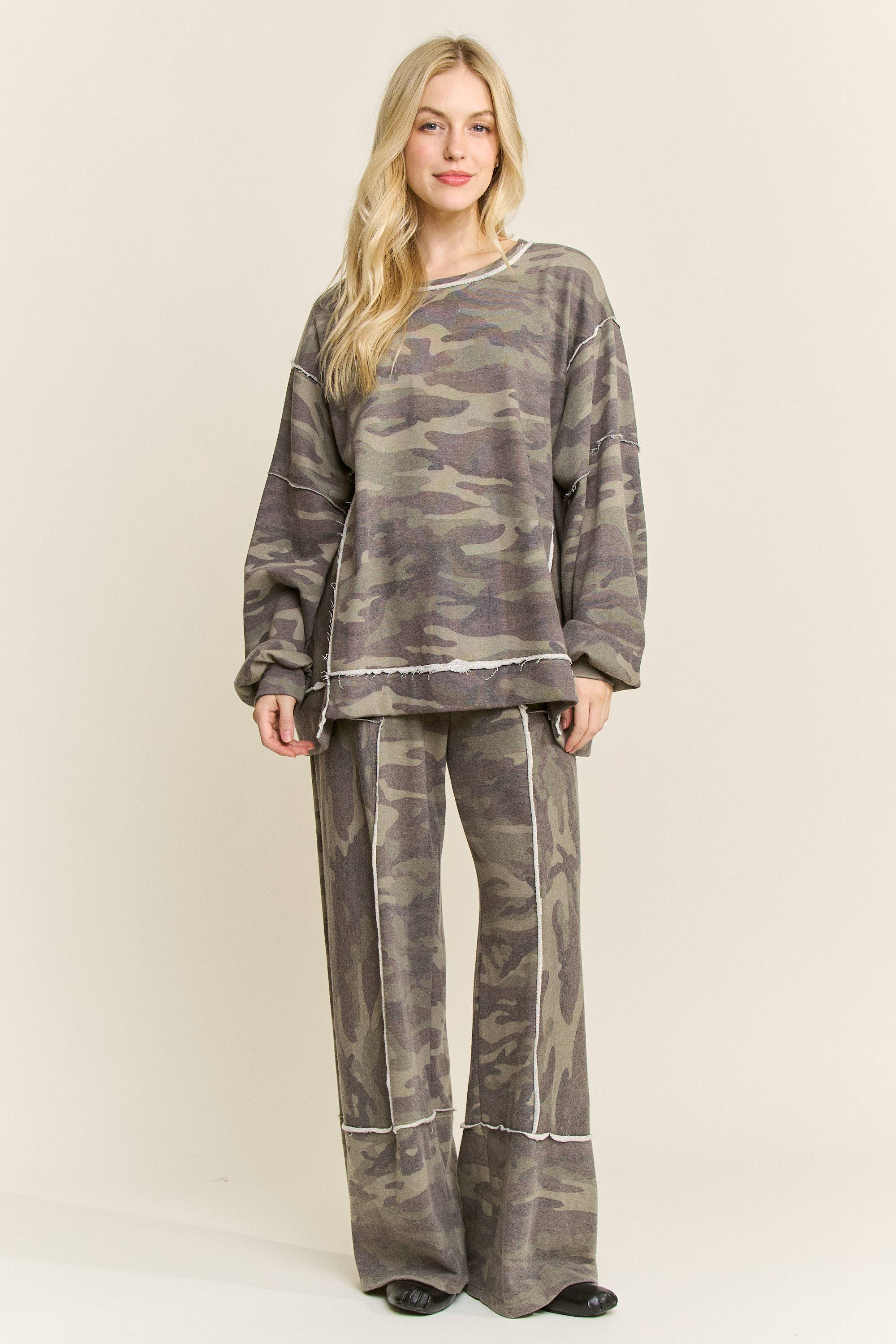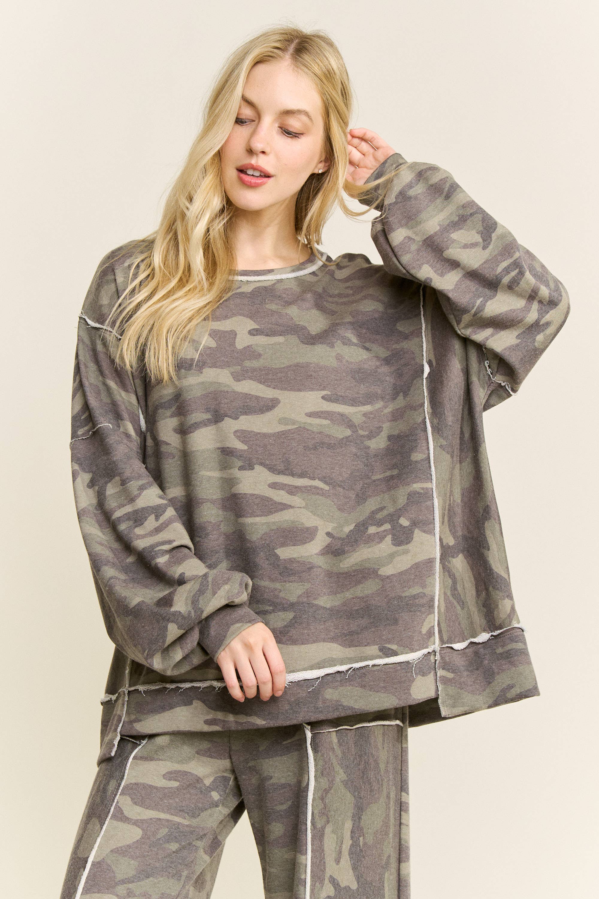 J.Her offers the Washed Camo Crewneck Sweatshirt Top, a unique addition to any woman's wardrobe. This sweatshirt, characterized by its distinctive washed camo design, showcases J.Her's commitment to delivering quality apparel. It blends comfort and style, making it a versatile piece for any wardrobe. Stand out with J.Her's Washed Camo Crewneck Sweatshirt Top.